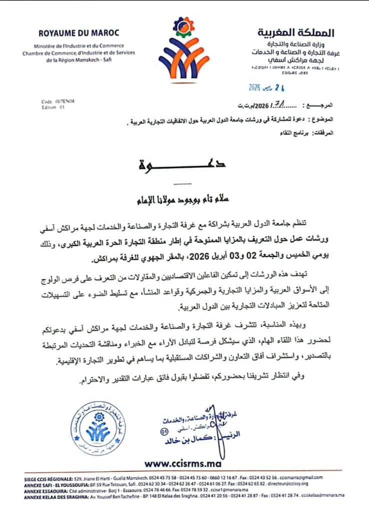 بينما تتجه الأنظار نحو تعزيز الصادرات الوطنية، تضع غرفة التجارة والصناعة والخدمات بمراكش “المنطقة العربية” في صلب اهتماماتها عبر ورشات عمل تقنية تنظم يومي 02 و03 أبريل 2026. المقال التحليلي لهذه الخطوة يشير إلى رغبة الغرفة في استغلال الاتفاقيات التجارية العربية البينية التي لا تزال دون مستوى الطموحات، وذلك عبر تبسيط “قواعد المنشأ” للفاعلين المحليين